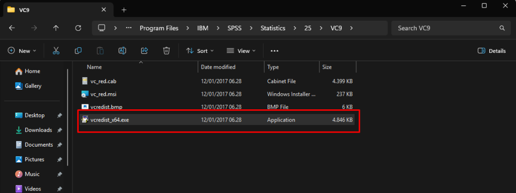 - Buka My Computer di Windows kamu lalu masuk ke direktori “C:\Program Files\IBM\SPSS\Statistics\25\VC9” pada folder VC9 kamu akan menemukan file yang bernama “vcredist_x64.exe” disini masalah SPSS akan teratasi jika kamu sudah menginstallnya. Nah jika versi SPSS kamu berbeda biasanya hanya berbeda di bagian folder 25, ini adalah versi SPSS jika kamu menggunakan versi 24 maka foldernya akan ada di direktori “\24\VC9” sama saja.